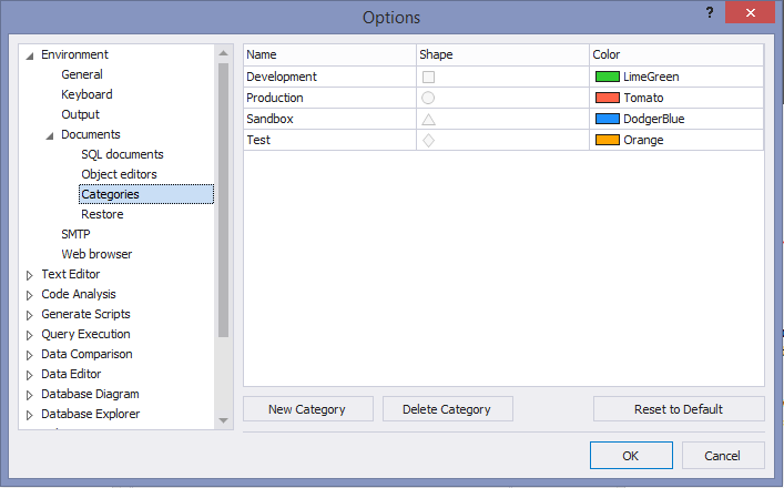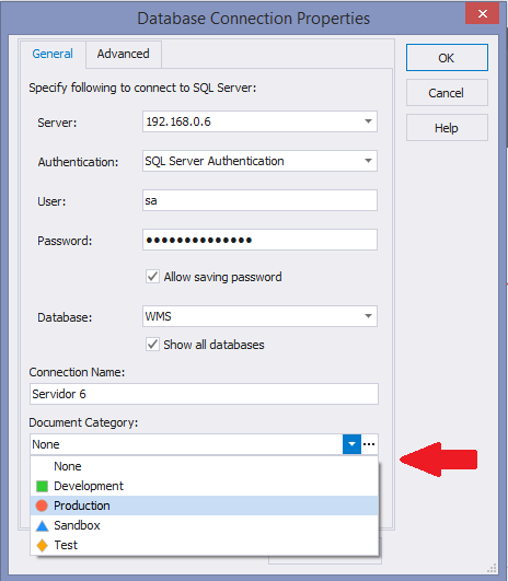 Outro ponto que vi como interessante é poder categorizar o documento de banco de dados em estudo, tendo algumas categorias padrão além da possibilidade de você criar suas próprias categorias, usual por exemplo para diferenciar bancos de dados “de teste” para os “de produção”. Veja nas imagens abaixo: