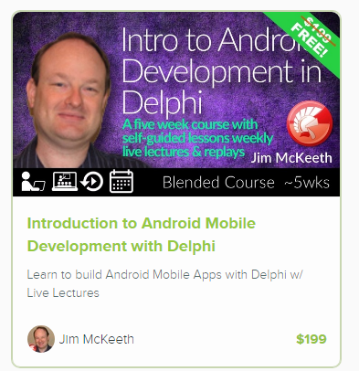 Atualmente encontrei este curso do Jim Mckeeth sobre Introdução ao Desenvolvimento Mobile Android com Delphi que está com 100% de desconto, isso mesmo Grátis!