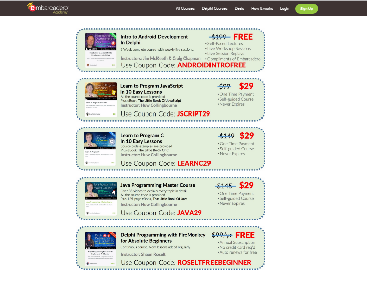 O programa Embarcadero Academy oferece cursos auto-estimados e ao vivo diretamente de alguns dos desenvolvedores mais conhecedores e experientes da indústria, oferece também bootcamps, conferências e replays on-line de alguns dos especialistas e treinadores mais reconhecidos do setor. São diversas linguagens de programação, ferramentas e frameworks, no entanto inicialmente você encontrará cursos Embarcadero Academy que se concentram principalmente em linguagens e habilidades orientadas para produtos Embarcadero, como RADStudio, Delphi, C ++ Builder, InterBase e Sencha.