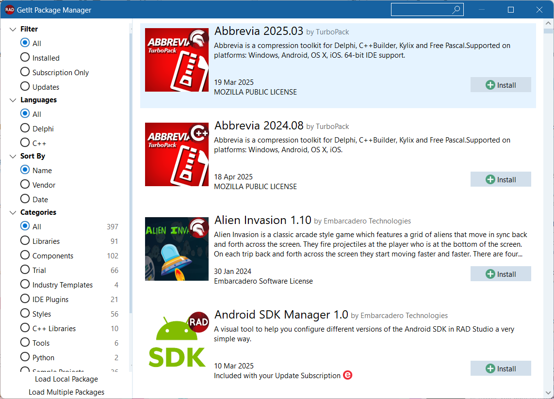 O novo recurso que podemos observar no RAD Studio 12.3 é que a partir de agora, o GetIt passa a exibir pacotes que têm atualização disponível, assim basta o usuário selecionar o pacote e clicar sobre a opção Update para fazer a atualização do pacote em questão.