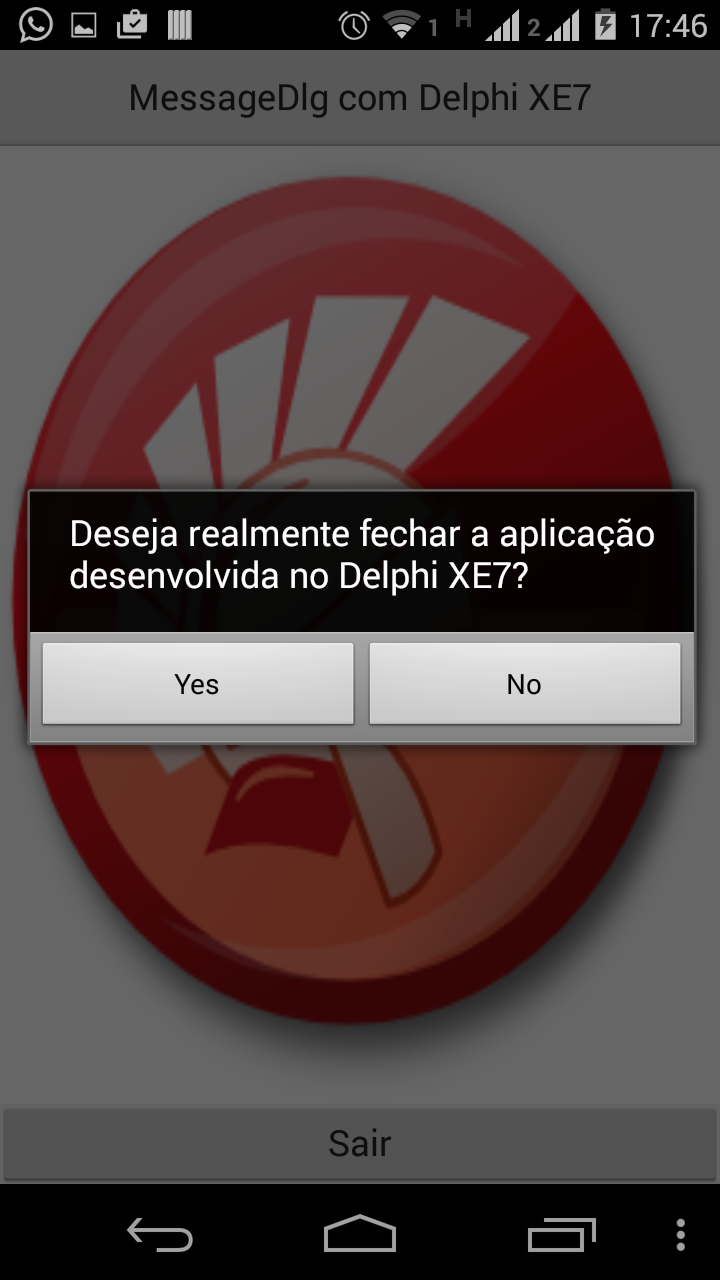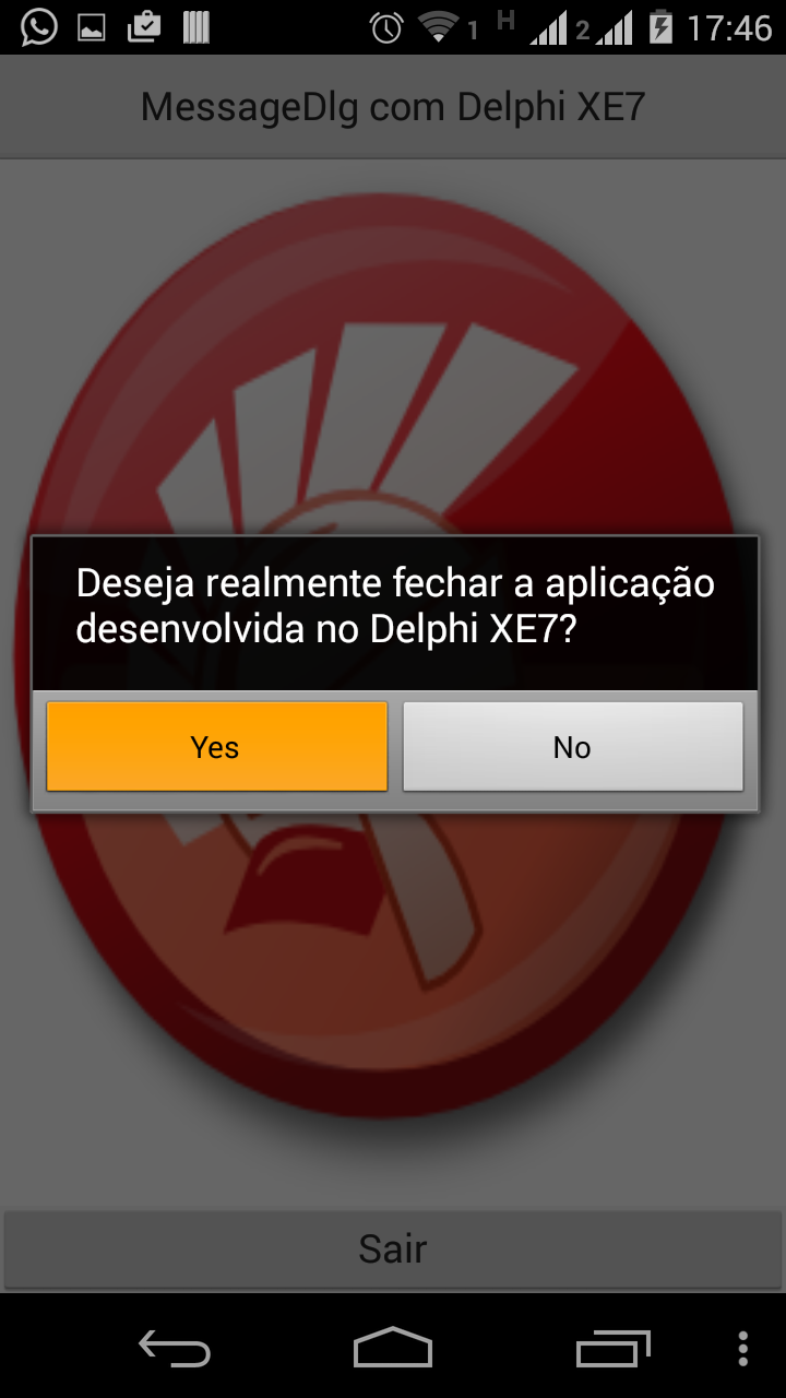 Se compilarmos e executarmos o mesmo projeto da postagem Encerrar aplicação Android através de Caixa de Diálogo com Delphi XE5 agora utilizando o Delphi XE7, nos depararemos com um erro durante sua execução no dispositivo Android vide imagem abaixo: