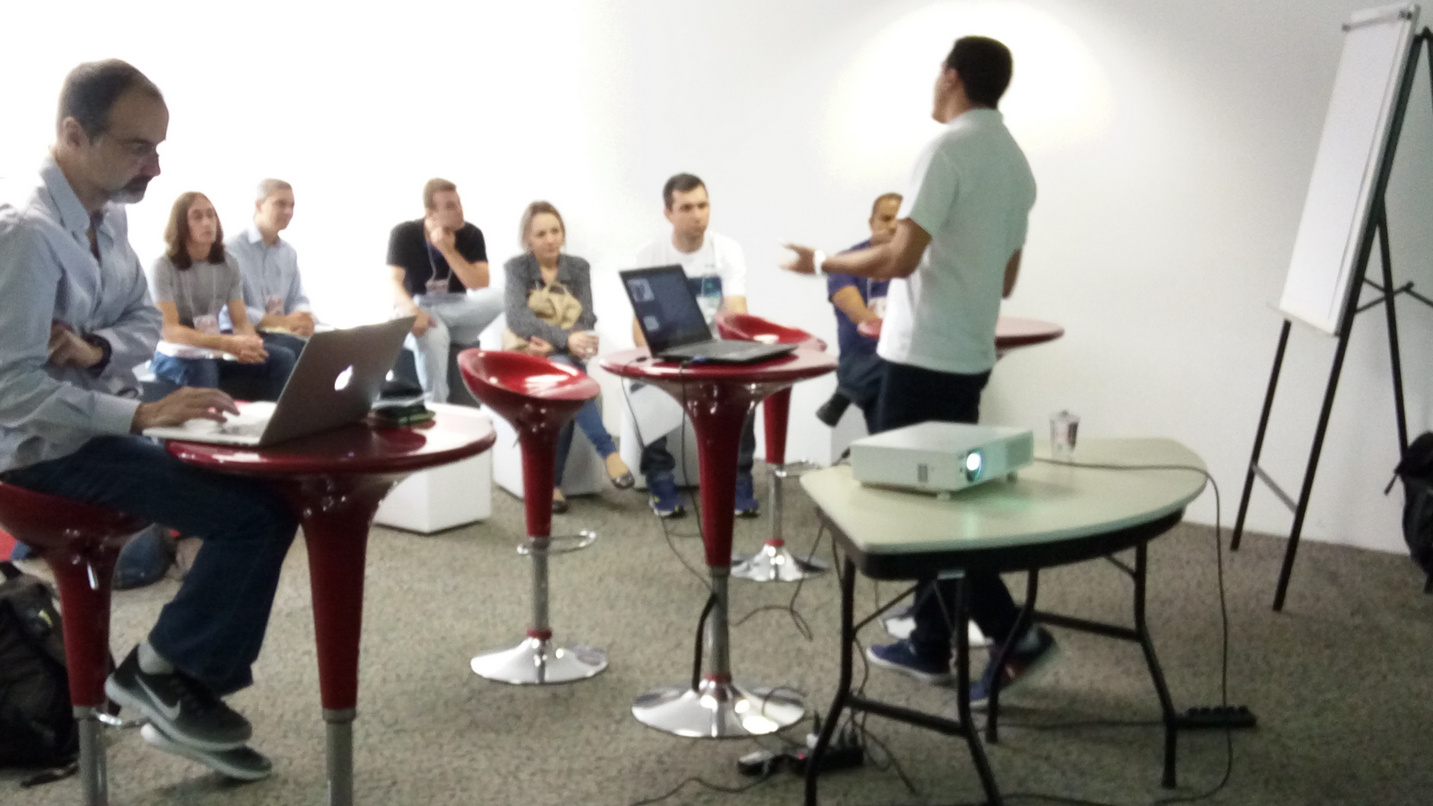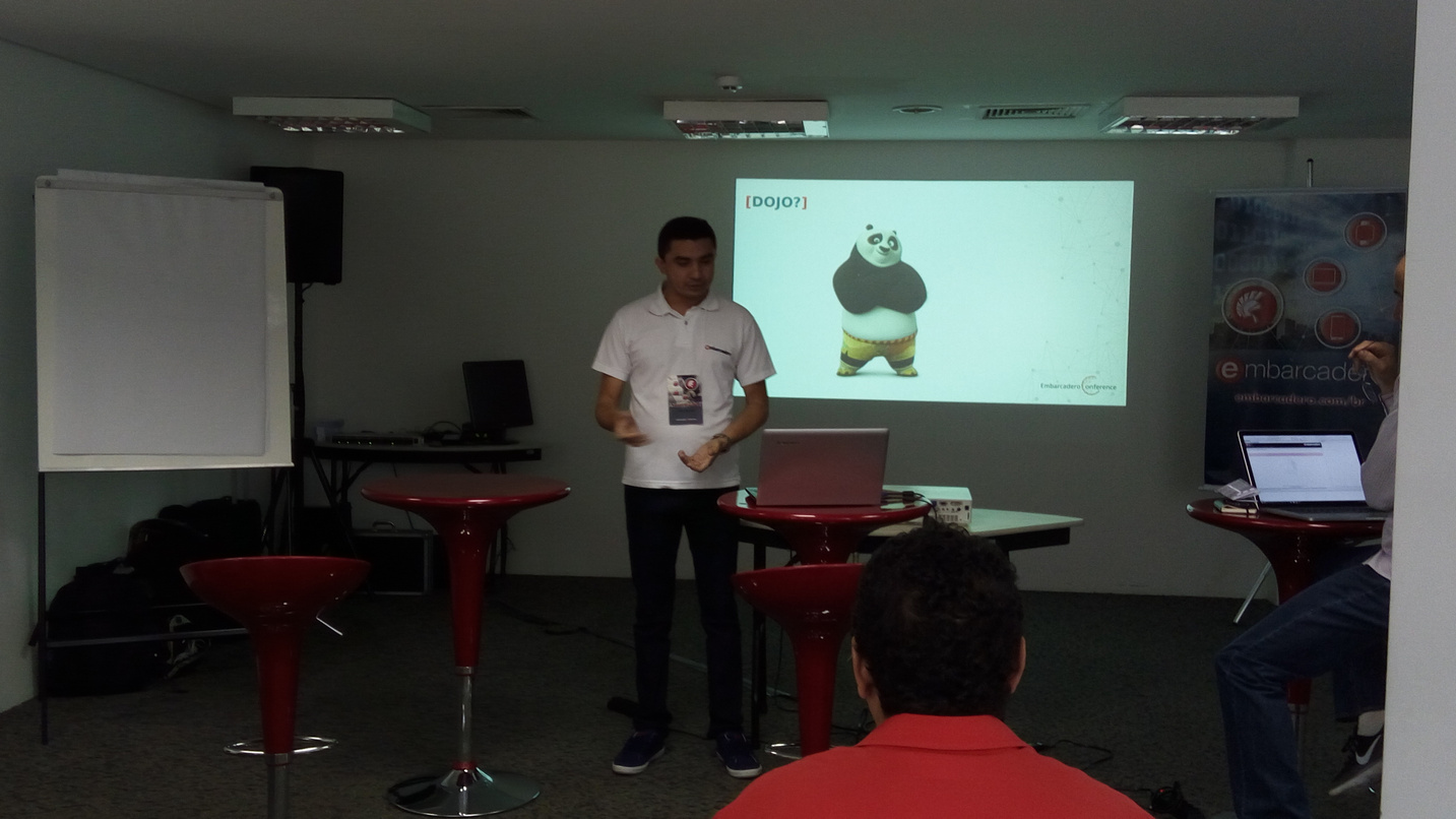 Terminada a abertura do evento me dirigi para conhecer uma das novidades da Embarcadero Conference 2016: o Coding DoJo uma trilha inteira com os próprios congressistas sendo estimulados a desenvolverem soluções propostas pelos palestrantes, e essa fera aí, José de Araújo, foi responsável pelo primeiro dos primeiros na Conference!