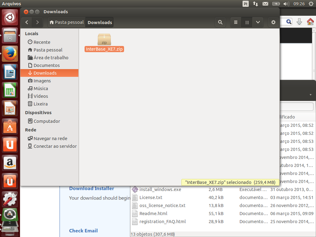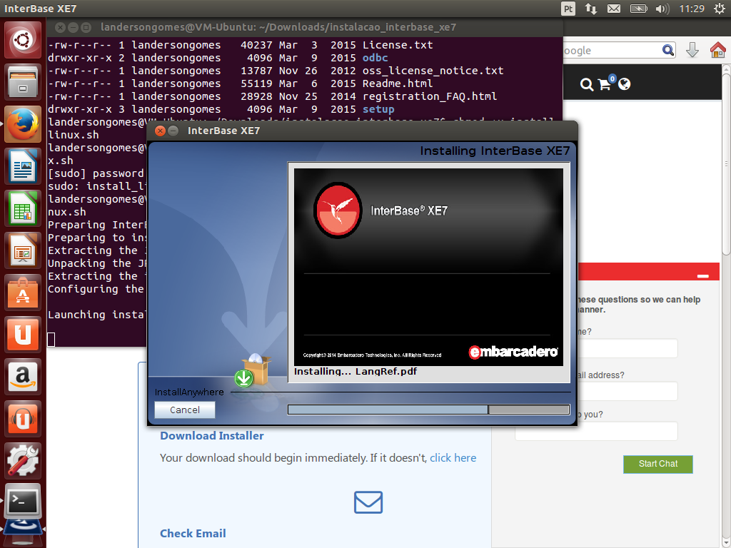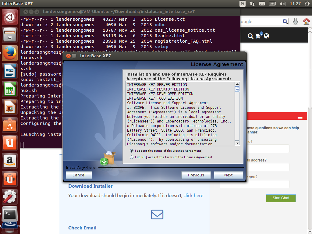 Nota: 1) No meu caso, fiz o download direto na máquina virtual Virtual Box em que tenho o Ubuntu instalado. 2) É necessário ser cadastrado na EDN (Embarcadero Developer Network), após logado você receberá um e-mail contendo o serial de ativação para sua instalação do InterBase.